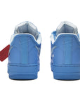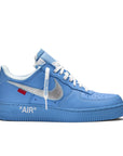 Off-White x Air Force 1 Low '07 'MCA' (CI1173-400) 鞋采用大学蓝皮革鞋面和金属银色 Swoosh,带有醒目的缝线和标志性红色标签。
